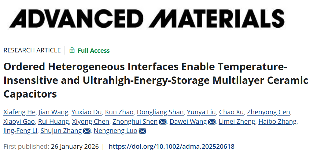 罗能能教授团队在电介质陶瓷材料领域实现重要突破,成功开发出兼具高储能密度和高温度稳定性的复合电介质陶瓷,并研制出多层陶瓷电容器(MLCCs)。相关研究成果于2026年1月26日以《Ordered Heterogeneous Interfaces Enable Temperature-Insensitive and Ultrahigh-Energy-Storage Multilayer Ceramic Capacitors》为题发表在《Advanced Materials》上 (//doi-org-s.vpn.dxcmcn.com:8118/10.1002/adma.202520618)。大象传媒