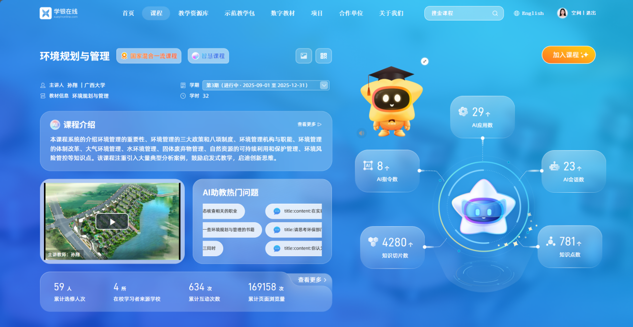 此次《环境规划与管理》获得国家级一流课程认定不是终点,而是新起点。《环境规划与管理》教学团队将继续深化 AI 技术与教育教学的融合,持续探索教育创新,打造以知识图谱为纽带、任务引擎为驱动的智慧教学共同体。通过 AI 技术实现个性化智能教学、学生智能学习和作业个性化推荐,构建人机协同教学新范式。