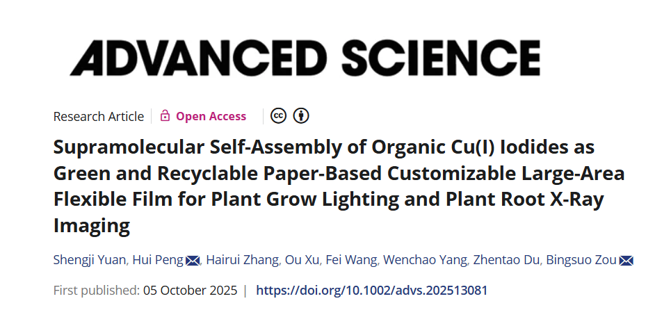 该团队通过超分子自组装策略,成功开发出一种基于滤纸和有机铜碘化物的可定制、大面积、可回收、可生物降解的柔性发光薄膜,并成功构建了一个集植物生长照明与植物根部X射线成像于一体的双功能平台。该研究成果以题为《Supramolecular Self-Assembly of Organic Cu(I) Iodides as Green and Recyclable Paper-Based Customizable Large-Area Flexible Film for Plant Grow Lighting and Plant Root X-Ray Imaging》发表于国际顶级学术期刊《Advanced Science》(IF = 14.1),彭辉博士和邹炳锁教授为共同通讯作者,硕士研究生袁升记为第一作者。大象传媒