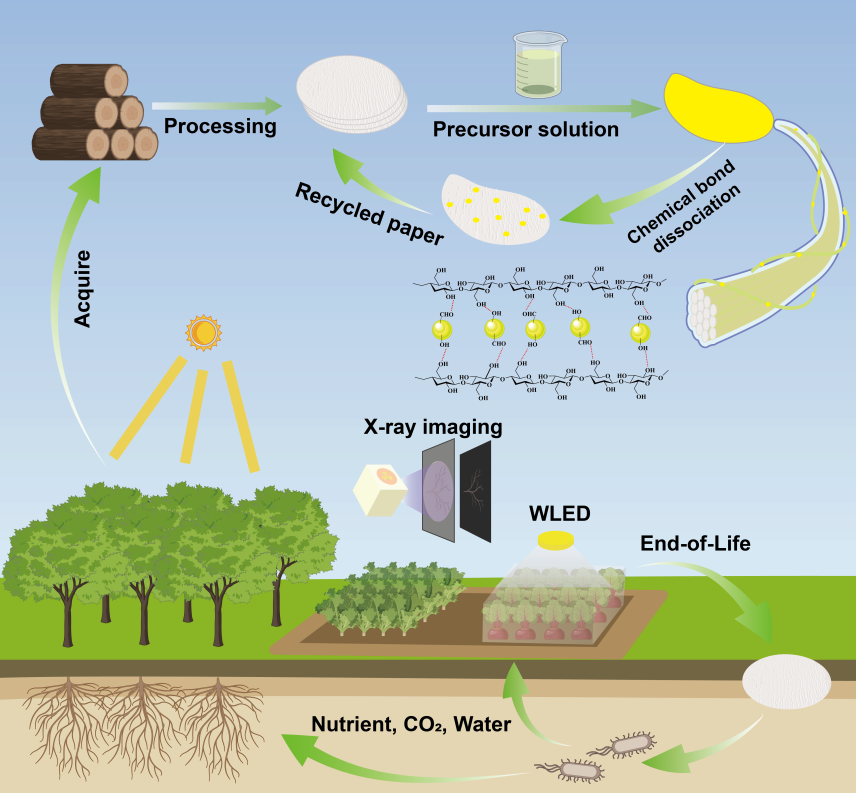 该薄膜还具备全生命周期绿色可持续特性,废弃薄膜可在DMF溶液中回收再利用,回收后的滤纸与化合物溶液可重新制备。此外,在自然土壤环境中,薄膜可被微生物降解为植物养分,参与碳循环,实现生态闭环。该研究不仅为智能农业提供了一种新型绿色、可定制、可回收的双功能光电平台,也为柔性电子器件的可持续发展提供了新思路。